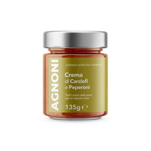 Vegetable cream with artichokes and peppers, sweet and savory, ideal with meats, fish salads, legumes, appetizers, and snacks.